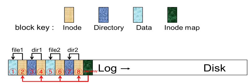 -> 기존의 리눅스 파일 시스템에서는 inode가 고정되어있고 superblock에서 해당 위치를 찾을 수 있었지만 LFS에서는 데이터를 write 할때마다 해당 inode는 추가로 append되므로 inode가 여러개가 된다. 따라서 inode map이라는 중간 계층을 도입해서 가장 최신의 inode 위치를 inode map에 저장하므로 inode 위치를 알 수 있다.