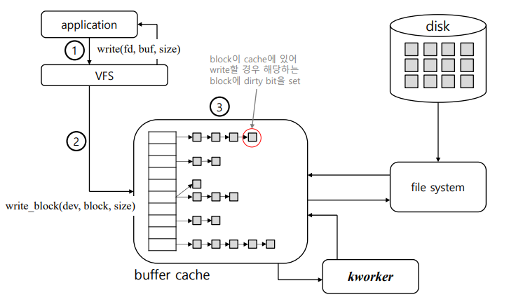 3. kworker 가 write를 수행한 block에 대해서 dirty bit을 체크하여 변 한 내용이 disk에 반영될 수 있도록 함